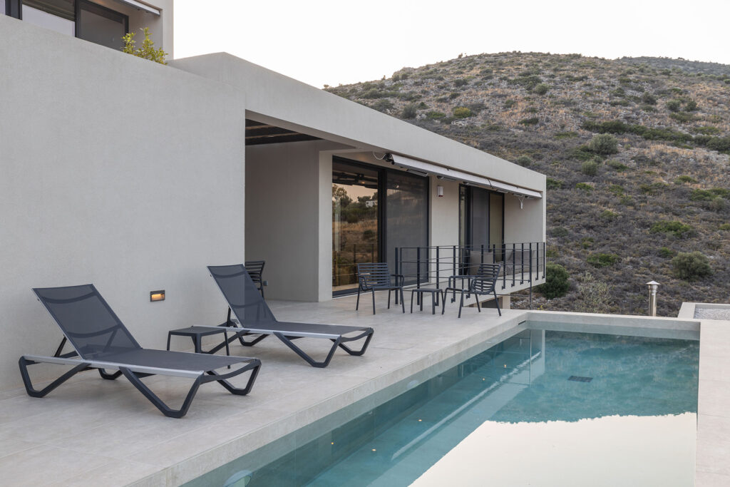 Ο σχεδιασμός των κατοικιών είναι τολμηρός, αλλά ταυτόχρονα ευαίσθητος και αυθεντικός, ενώ οι εξωτερικοί χώροι πρασίνου, περιμετρικά των δωματίων, προσφέρουν ανεμπόδιστη θέα στον κόλπο και τα γύρω βουνά, καθώς και ένα ευρύ φάσμα "σημείων χαλάρωσης", ανάλογα με την κατεύθυνση του ήλιου. Στη νότια πλευρά κάθε κατοικίας, ένας προστατευμένος εξωτερικός χώρος που σκιάζεται από καλάμια συμπληρώνει λειτουργικά τους χώρους ημερήσιας φροντίδας και τραπεζαρίας. Το σύστημα εξωτερικής θερμομόνωσης διατηρεί τις βίλες δροσερές το καλοκαίρι και ζεστές το χειμώνα.