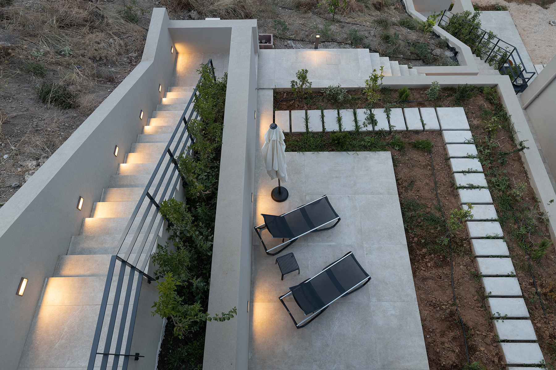 Μια εξωτερική, χαμηλής γωνίας, σκάλα συνδέει τις τρεις κατοικίες.